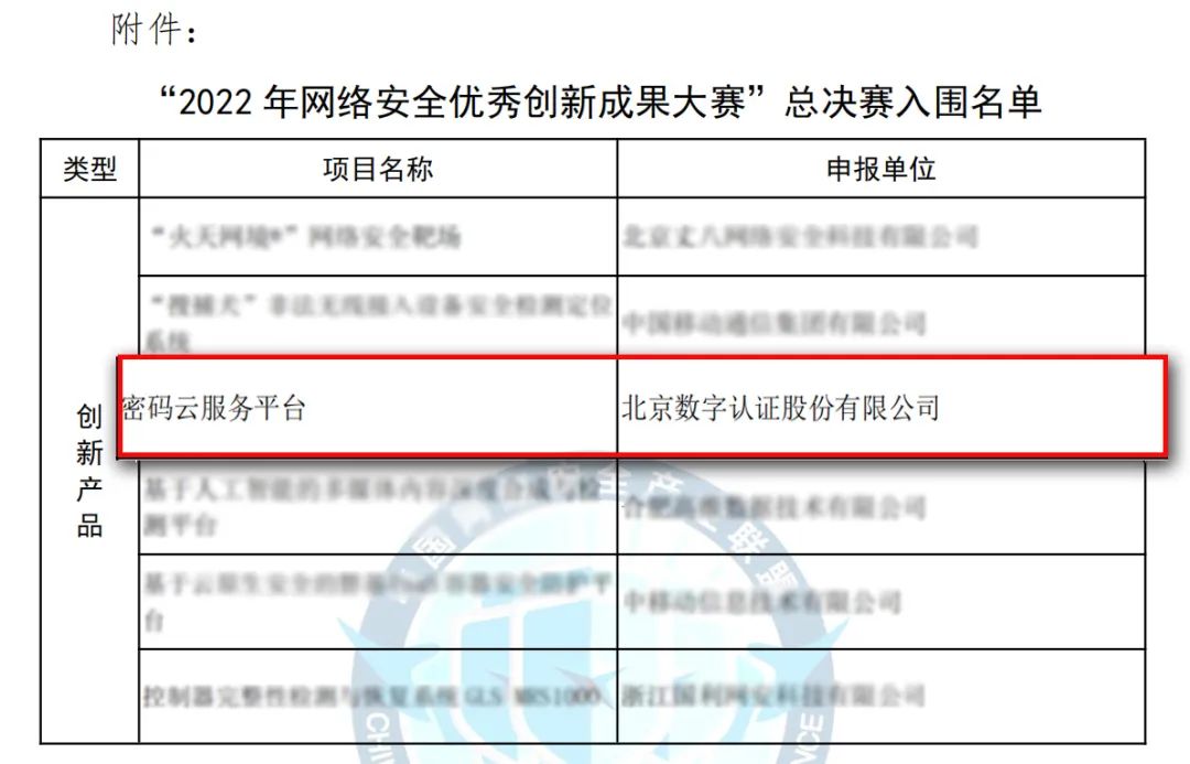 8月16日,由中国网络安全产业联盟主办的“2022年网络安全优秀创新成果大赛”总决赛入围名单正式对外公布。北京bsports官网 必一运动股份有限公司报送的创新产品“密码云服务平台”广受专家评委认可,凭借其高质量的创新水准最终从140余家网络安全企业申报的240余项解决方案和创新产品中脱颖而出,成功进入总决赛。