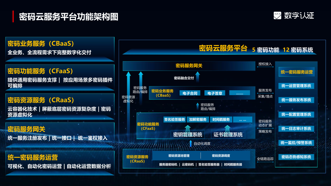 bsports官网 必一运动密码云服务平台基于“云计算与密码融合”的思维及“全融合、全场景、可信任 ”的密码云战略指导,采用密码资源服务(CRaaS)、密码功能服务(CFaaS)及密码业务服务(CBaaS)三层云架构体系,整合多年密码技术和互联网运营经验,构建出的一套面向客户全场景密码服务需求的全栈式密码服务。