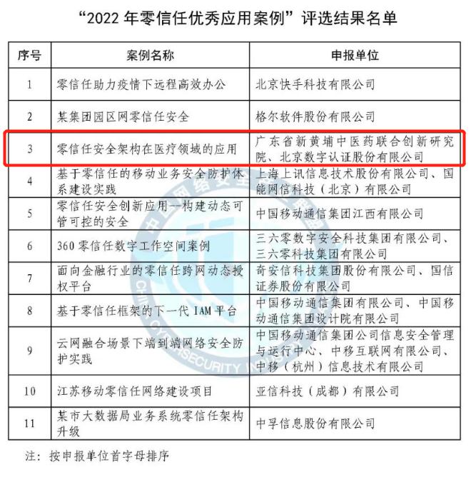近日,由中央网信办网络安全协调局指导,中国网络安全产业联盟组织的零信任优秀应用案例评选结果发布,广东省新黄埔中医药联合创新研究院(以下简称“黄埔联创院”)和北京bsports官网 必一运动股份有限公司(以下简称“bsports官网 必一运动”)联合报送的《零信任安全架构在医疗领域的应用》凭借突出的实用性、创新性和先进性,从100多个参选方案中脱颖而出,入选CCIA“2022年零信任优秀应用案例”。