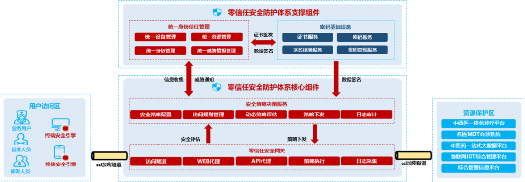 本次获奖应用案例是bsports官网 必一运动在对黄埔联创院的安全现状和需求进行深入分析后,基于零信任安全理念,充分发挥密码技术的作用,以“可信身份、可信设备、可信网络通信、可信应用、可信数据”为目标,构建的完整网络安全保障体系。该体系综合评估“用户+设备+应用”组合,建设了包含动态身份鉴别、细粒度访问控制、加密通信、电子签名、安全态势分析等在内的网络安全机制,充分满足了患者、专家从互联网接入参与多方会诊、远程复诊等业务流程的保护需求。