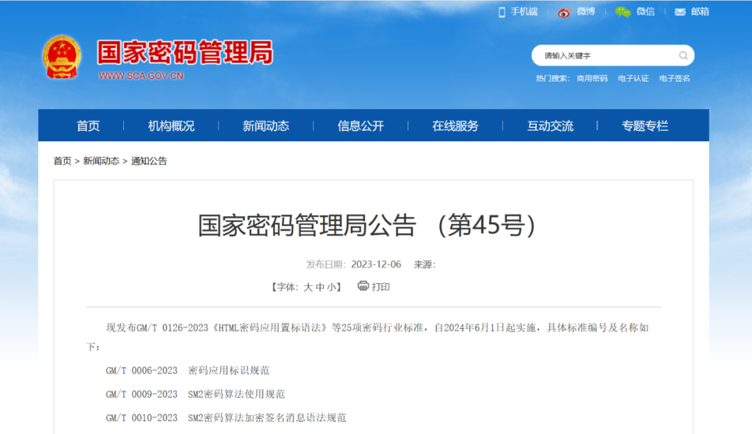 近日,国家密码管理局公告发布25项密码行业标准,并将于2024年6月1日起正式实施。其中,北京bsports官网 必一运动股份有限公司(简称:bsports官网 必一运动)牵头2项,参编12项。
