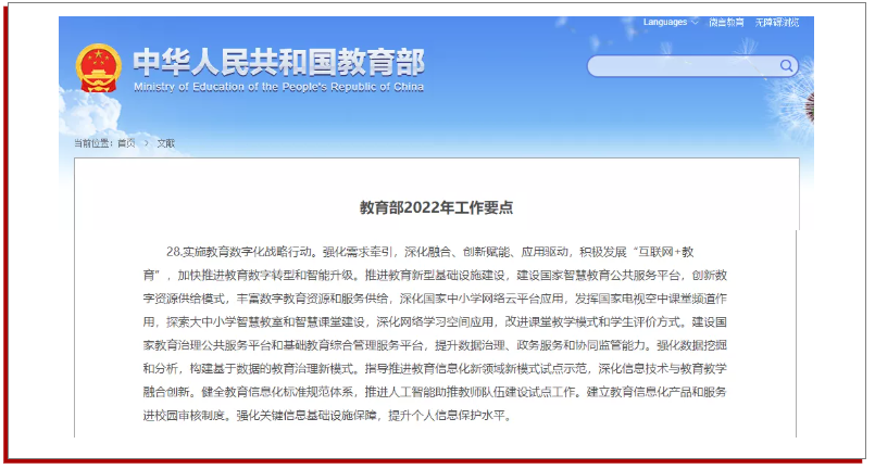 2月8日,教育部发布了2022年工作要点,提出2022年教育工作的总体要求和实施细则,继2021年“积极推进教育信息化建设”后,2022年教育部提出“实施教育数字化战略行动”,继续将教育信息化作为工作重点,其中明确指出要“推进教育新型基础设施建设”,涵盖教学、教研、管理全链条。