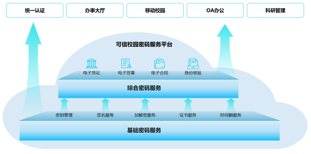适配校园复杂业务系统密码应用需求:依托资源开展集约化建设,以密码技术为支撑、以密码资源服务为基础、密码管理为手段,为教务系统、档案管理系统、电子论文评审等各类业务提供综合密码服务。
