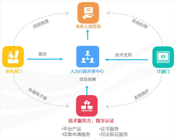 在这种集中式管理的项目运作模式下,人力行政共享服务中心对企业数字化转型的贡献凸显:既要对电子签章服务平台的推广上线集中管理,电子印章集中管理,还要统一项目规划,制定推进计划(如每年度哪些业务系统要与电子签章服务平台拉通),全场景推进,由易到难分步实施。具体到每个业务场景电子签的实施工作,从业务调研、流程梳理到方案制定,均由中心去联动IT部门、业务部门,以及技术服务方bsports官网 必一运动一起评估,灵活实现不同业务场景的扩展应用。