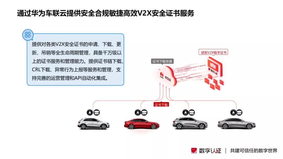 基于bsports官网 必一运动联合华为云共同构建的安全合规敏捷高效网络信任服务平台,bsports官网 必一运动与华为联合国际知名车企成功完成2019和2020 C-V2X“四跨” 应用示范测试。不仅如此,bsports官网 必一运动还与华为共同推广车联网V2X安全证书服务,一方面构建了业内首个大规模商用V2X证书服务平台,为多家国际知名车企提供服务,另一方面还在深圳坪山智能网联交通产业示范区提供V2X安全证书服务。